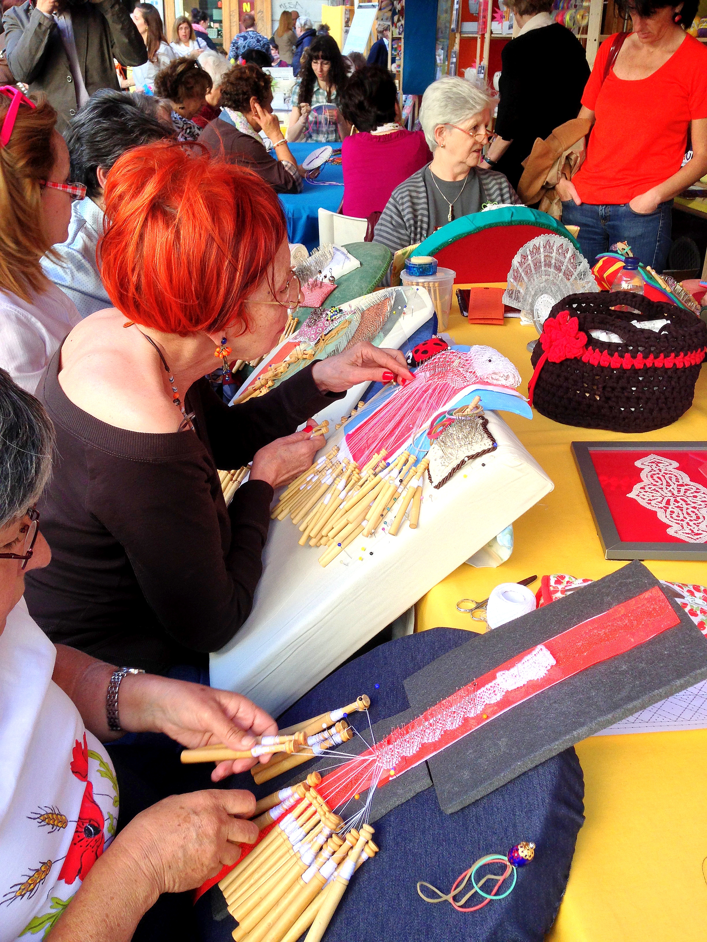 2013-05-09 18.28.20 HDR okAllí se reunen cada tarde un montón de mujeres de todas las edades y hacen sus labores. Me sorprendió mucho el taller de bolillos, yo creía que era ya un arte casi, casi en extinción, porque es bastante complicado de hacer. Pues no. Los talleres de costura de la casa Pontejos, porque antes no eran tiendas si no «casa», lo mantiene vivo aunque sólo sea por las tardes en esa plaza.