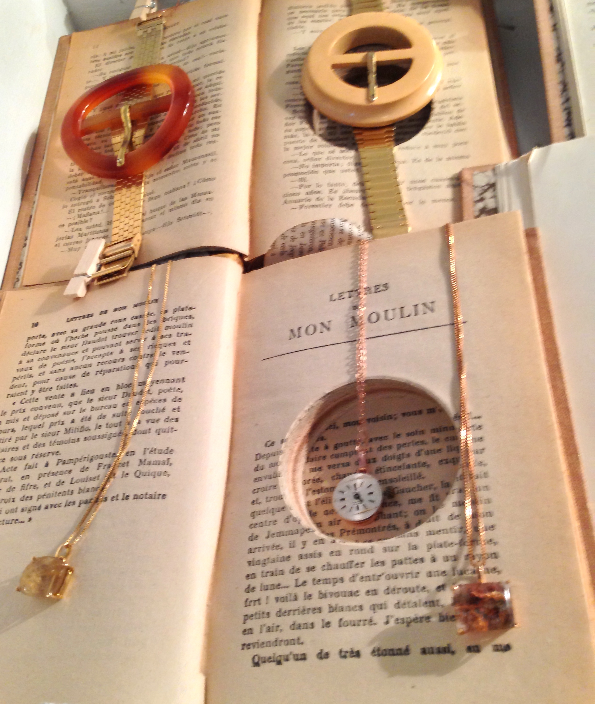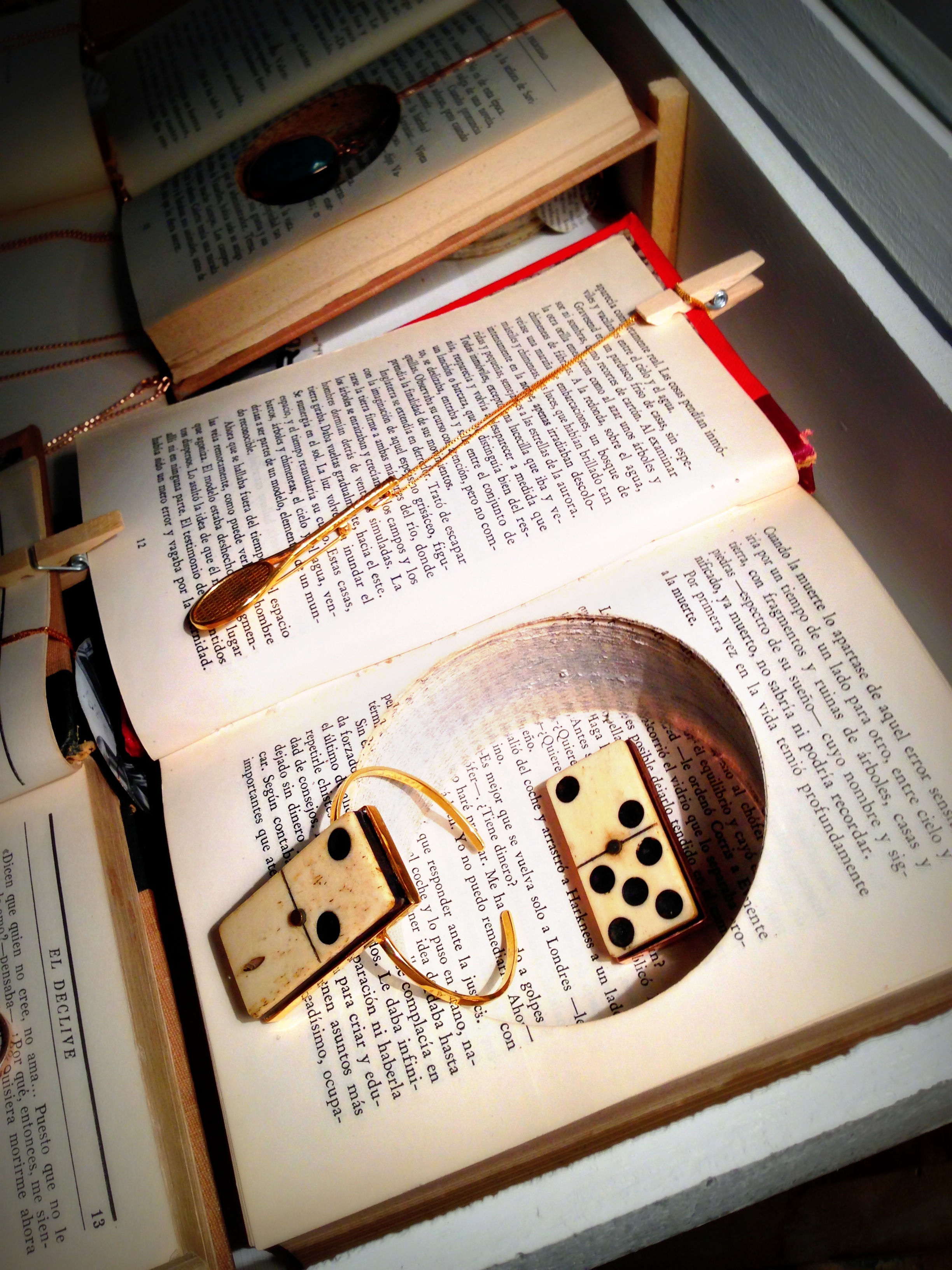 OLD STORIESOLD STORIES 2TO BE continued… Belén Fernández- Vega reconvierte piezas antiguas que encuentra en anticuarios, y les proporciona una nueva vida. Piezas de cristal de lámparas antiguas se convierten en collares, fichas de dominó en pulseras, etc.. Y las presenta en el interior de libros cosidos a mano, como si de un tesoro nuevamente encontrado se tratase. Una idea muy linda.